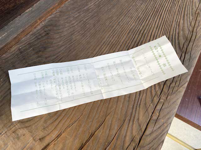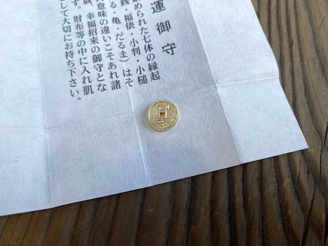 おみくじには開運御守が入っています。「福銭・福俵・小判・小槌・かえる・亀・だるま」の7体の縁起物があり、それぞれ意味の違いこそあれ諸願成就、幸福招来の御守となります。財布などの中に入れ肌守として大切に持つとされています。