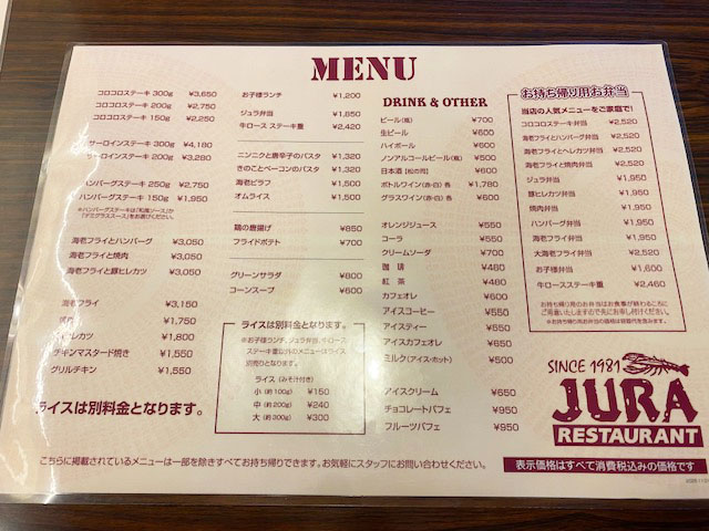 こちらは通常メニュー、本当に洋食レストランといった感じです。昔、近所にあったレストランもこんなメニューだったなぁ~と懐かしい気持ちになりました。お酒類やパフェテイクアウトまであるので大人から子供まで幅広い年代のお客様が来られてました。