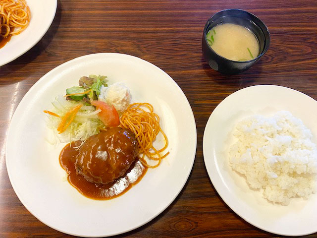 迷いに迷って注文したのはハンバーグランチ。ソースたっぷりのハンバーグにケチャップパスタ、彩りのバランスが取れたサラダ、味噌汁にライスとお手本のようなハンバーグランチ。見るからに美味しそう!