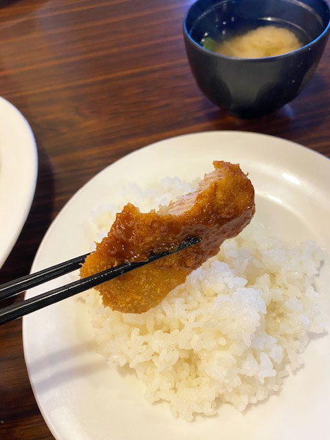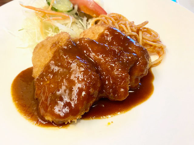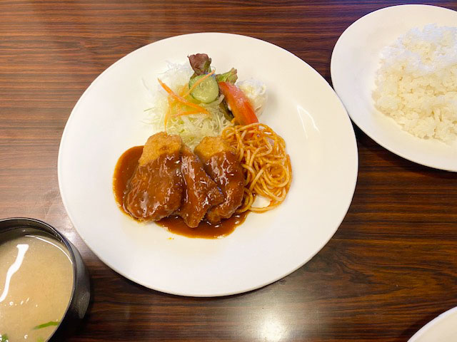 うんうん、めちゃめちゃ美味しい!やわらか~いカツにデミグラソースが最高に合う!サクサク系の豚カツではなくソースが染みこんだしっとり系のフライです。どうしてフライにかかっている洋食屋さんのソースはこんなに美味しいのでしょうか?こいつはご飯が止まらない系ですね!とんかつ屋さんでは味わえない洋食屋らしい、上品な味です。