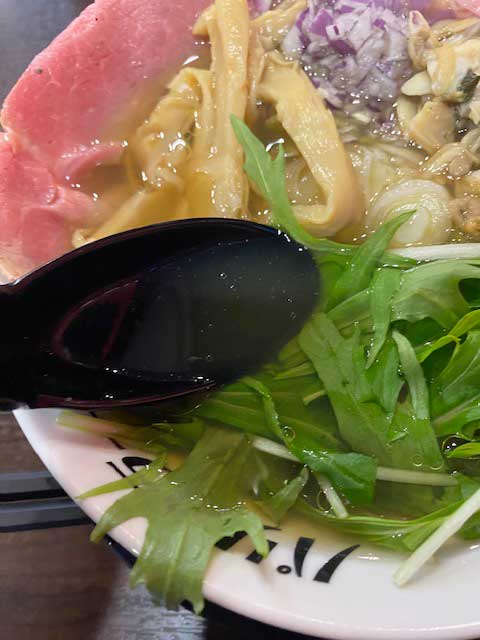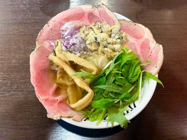 レアチャーシューとプリプリのあさりむき身、穂先メンマ、白ネギ、紫玉ねぎ、水菜などがトッピング