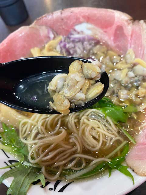まずは貝出汁ラーメンから、あさりかしじみか迷ったのですがあさりにしてみました。レアチャーシューのピンクが鮮やかなビジュアル。美味しそうですね!