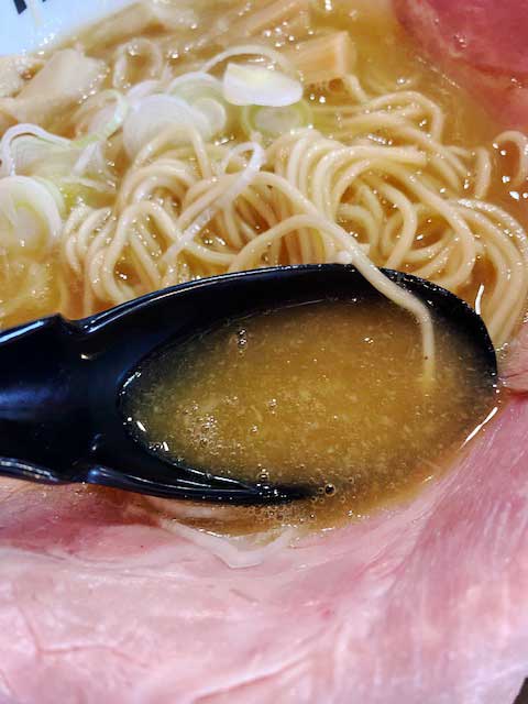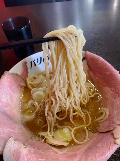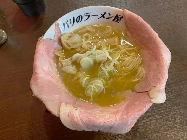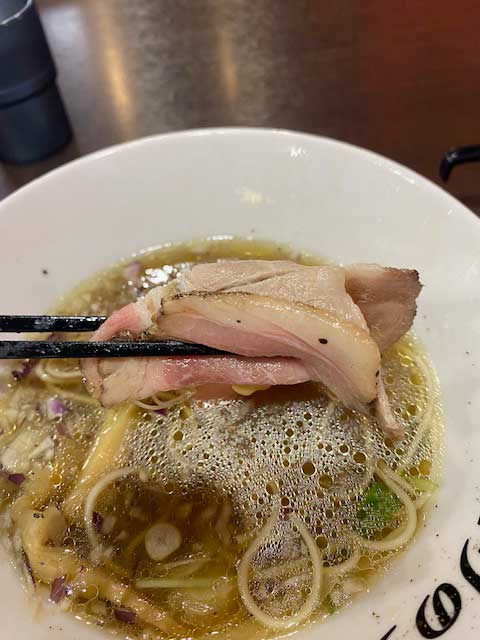 こちらは鶏白湯、見るからに旨味たっぷりという感じの黄金色のスープ。レアチャーシューも大判が入っています。