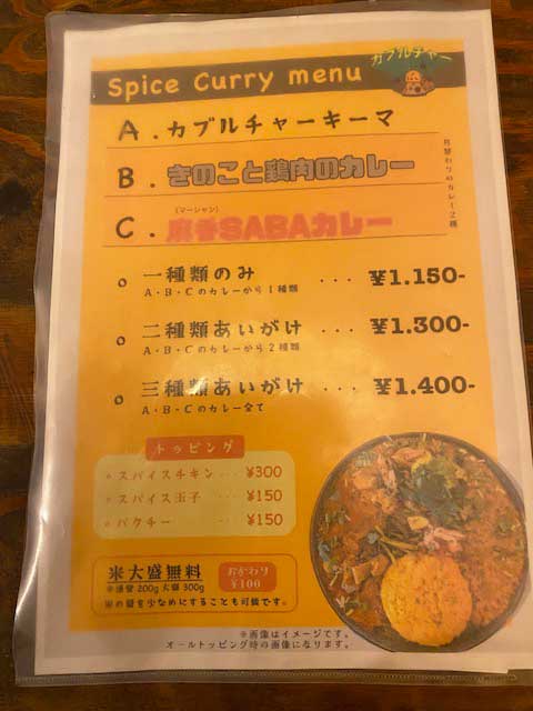 メニューです、A/B/Cの3種類のカレーからお好みでチョイスするシステム。Aがベースとなるカブルチャーキーマカレー、BとCが月替わりのカレーです。今回は時差投稿の為、月替わりのカレーは現在とは異なるメニューですので御注意ください。