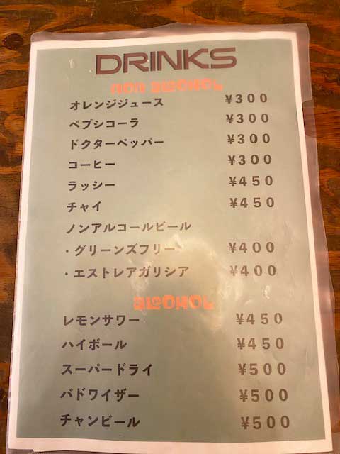 ちなみおドリンクはこんな感じです、種類も多くてお酒もあるのが嬉しい!(私は車なので飲めませんが、、、)ラッシーやチャイがあるのが本格的で良いですね!