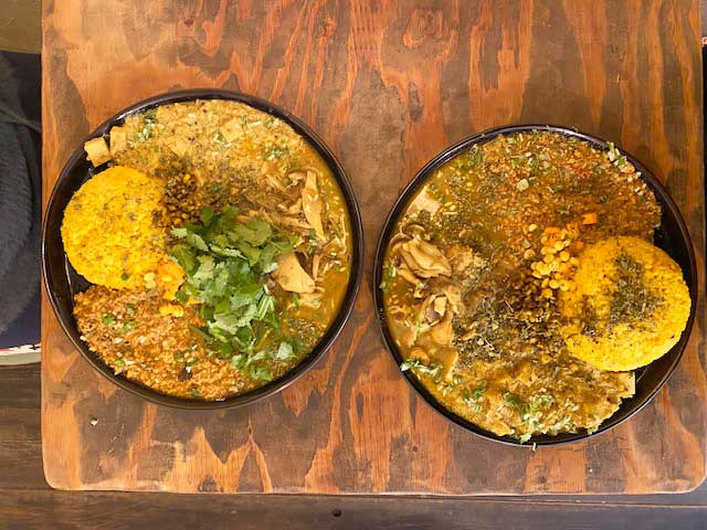 到着です、どちらも3種あいかけですが左はパクチートッピングで右はご飯大盛りです。美しいビジュアルが食欲をそそります!