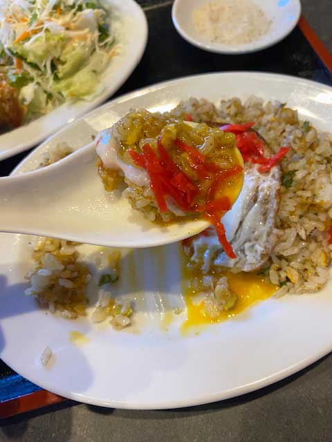 次は卵と一緒に頂いて、、、、まぁそのままの味ですね、笑 卵の分、まろやかさが加わりました。一般的な卵が入っている炒飯よりも目玉焼きが乗っている方が卵の主張が強いのでボリュームがあるように感じますね。
