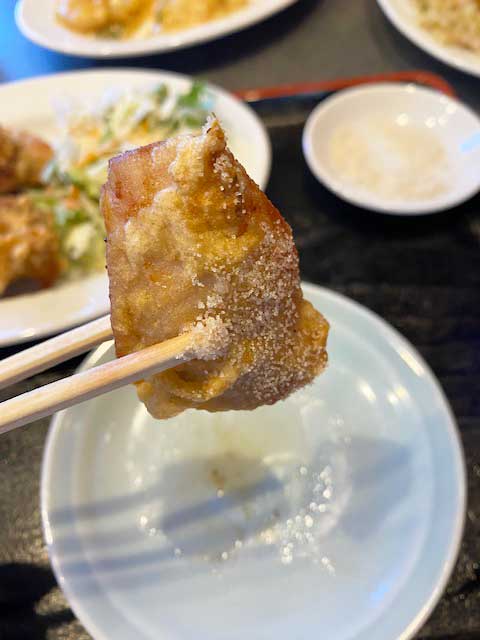 言葉で説明すると難しいのですが衣が美味しいですよね。カラっというよりはややモッチリ?天ぷらと唐揚げの中間のような衣は下味もしっかりとしていいて白飯とかき込む為に生まれたような美味しさがあります。